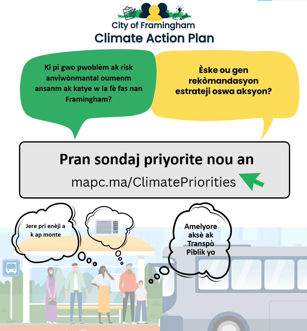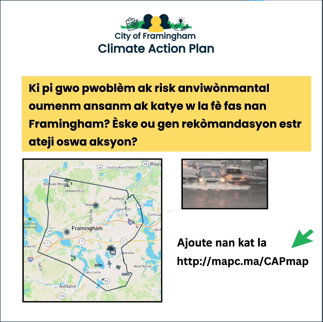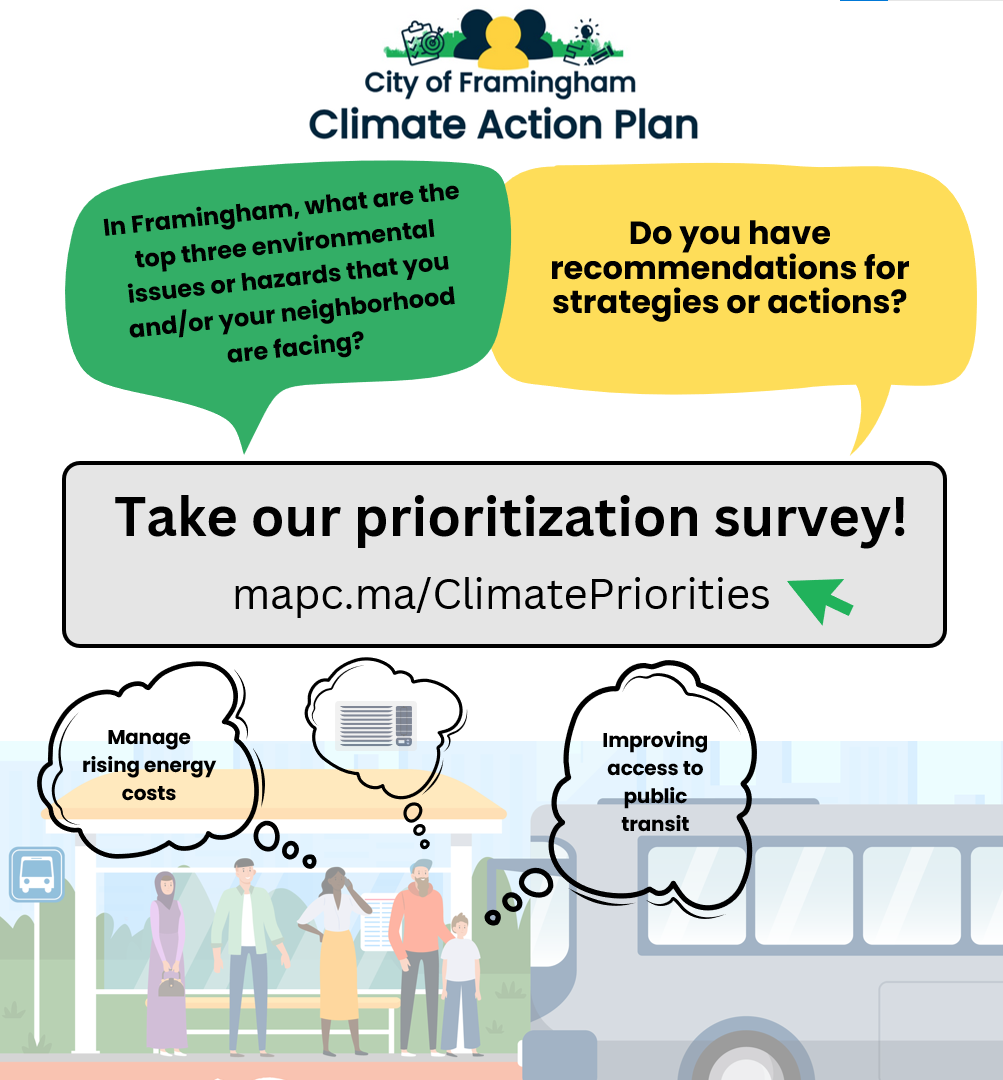 🌍 MetroWest Climate Equity Project - The City of Framingham partnered with the Towns of Natick and Ashland as well as the Metropolitan Area Planning Council (MAPC) to learn from residents of local Environmental Justice communities about their climate change priorities and ways that we could support and facilitate long-term engagement on climate change resilience and action. The MetroWest Climate Equity Project serves as a foundation for the development of the Climate Action Plan and the community engagement work that is planned.