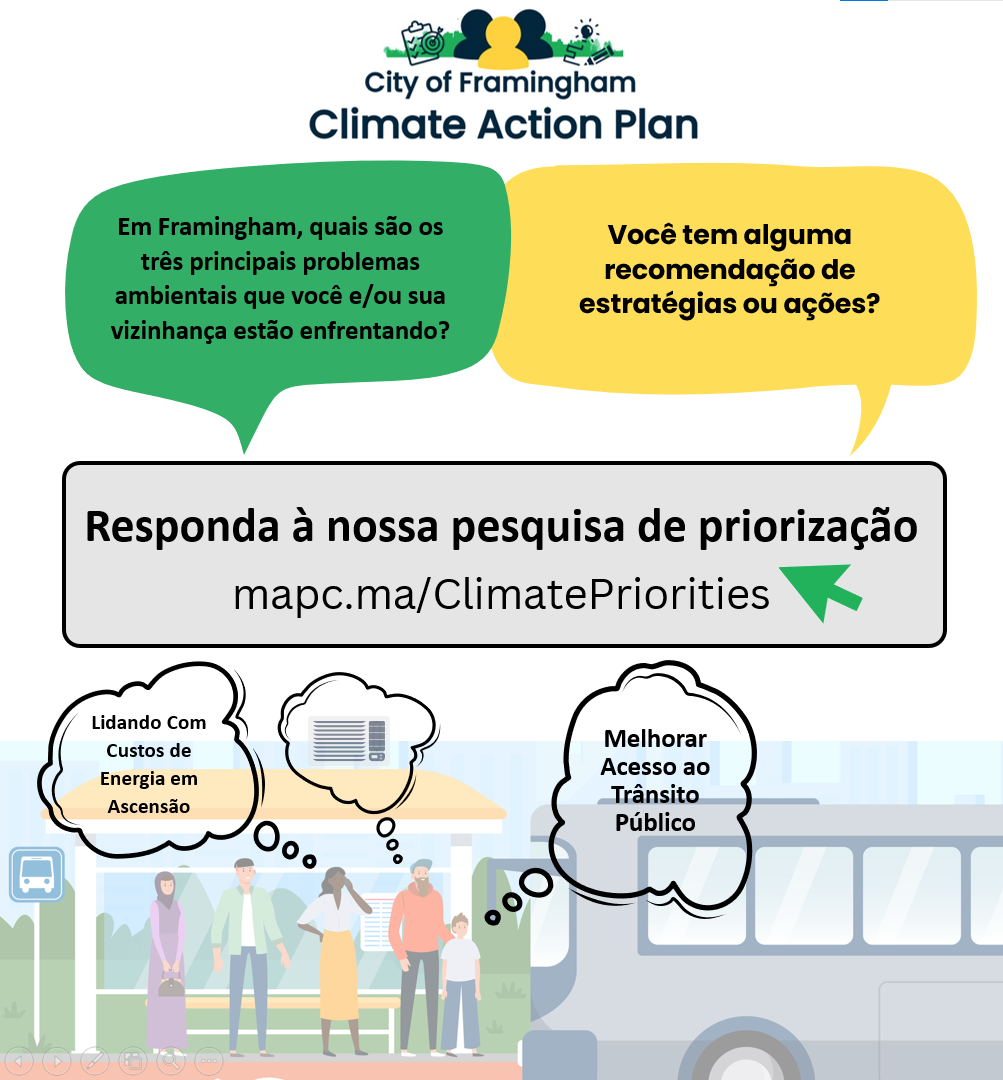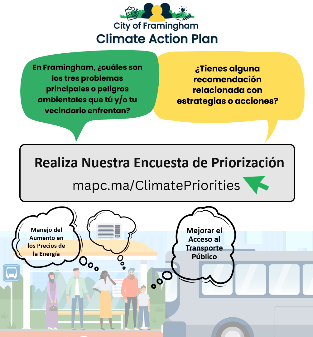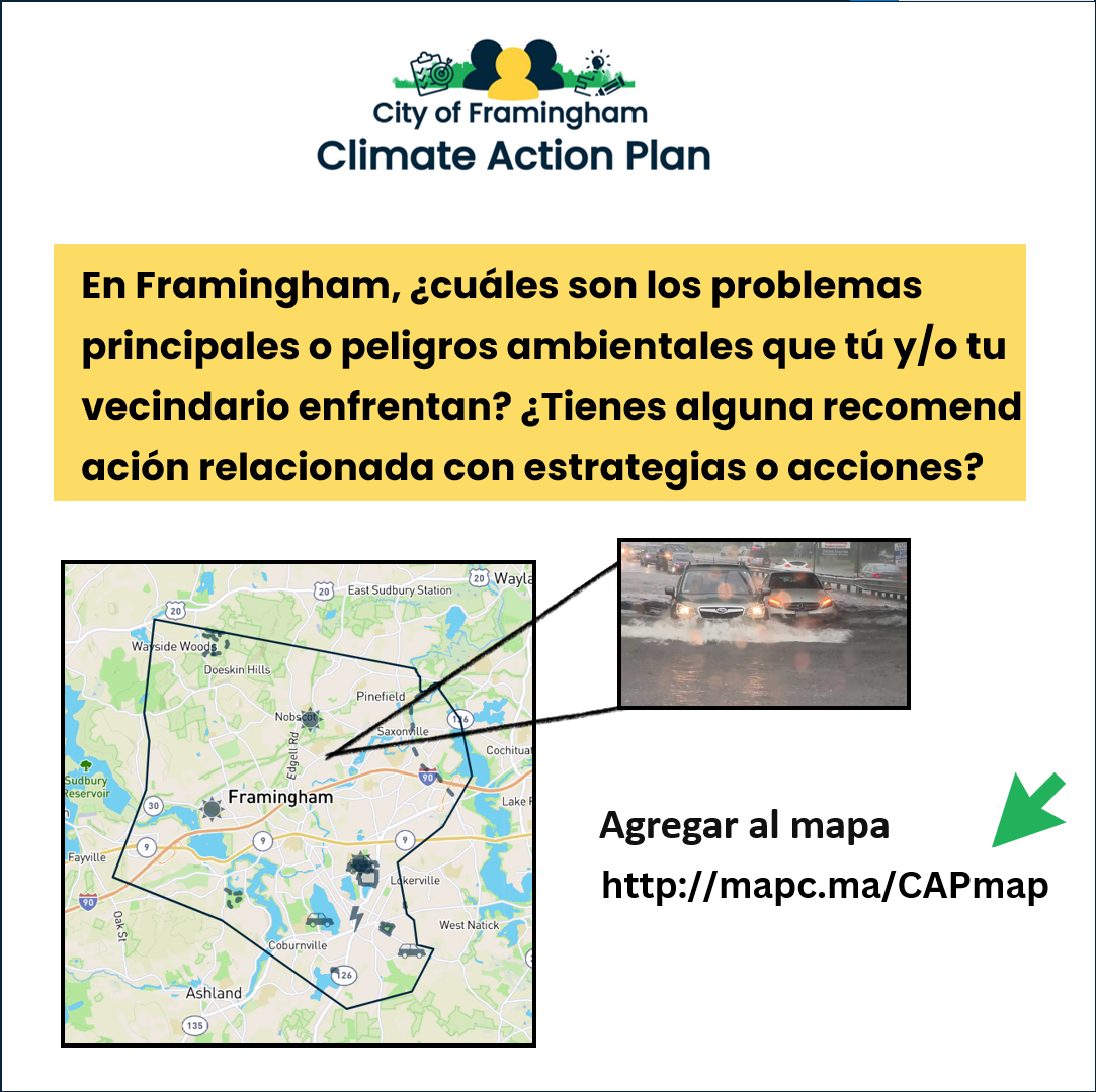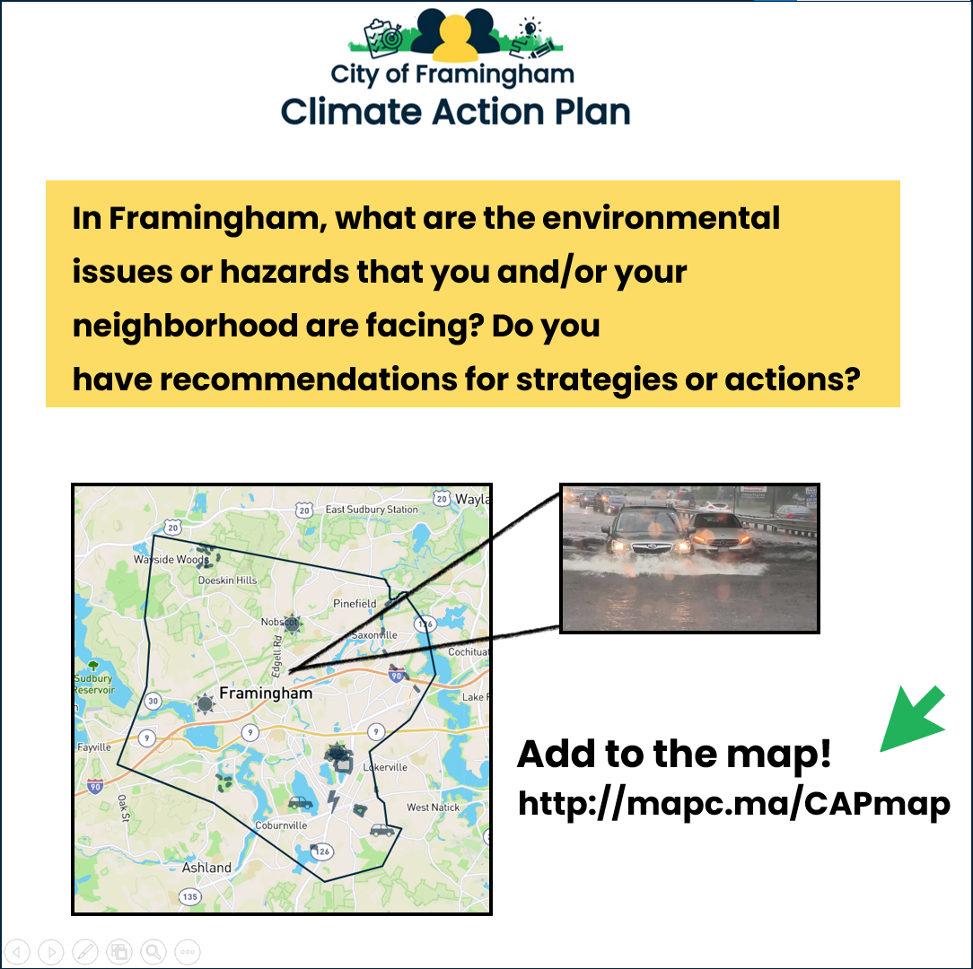 🌍 MetroWest Climate Equity Project - The City of Framingham partnered with the Towns of Natick and Ashland as well as the Metropolitan Area Planning Council (MAPC) to learn from residents of local Environmental Justice communities about their climate change priorities and ways that we could support and facilitate long-term engagement on climate change resilience and action. The MetroWest Climate Equity Project serves as a foundation for the development of the Climate Action Plan and the community engagement work that is planned.